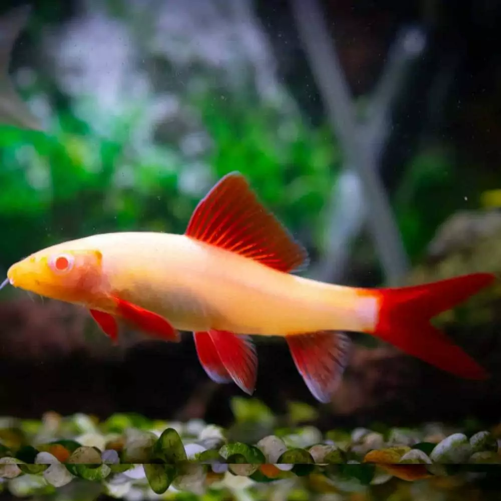 General Information: Known for their distinctive albino coloration and vibrant red eyes, Albino Rainbow Sharks are not actual sharks but rather a type of freshwater fish belonging to the Cyprinidae family.